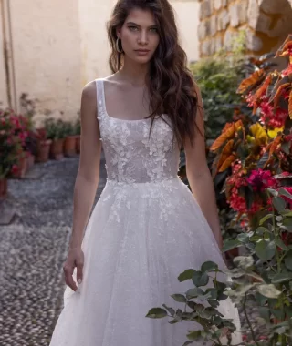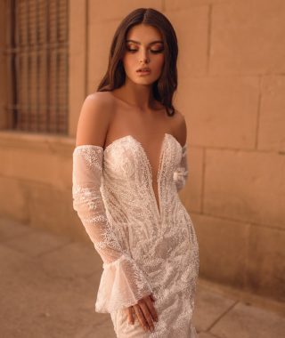 Ніжна весільна сукня із знімними рукавчиками та розшитим корсетом. Юбка виконана в напівпрозорій органзі.